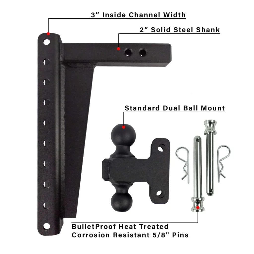 - The BulletProof 2.0″ HeavyDuty 14″ Drop or Rise Hitch is unlike any of the competitors’ products. This amazing hitch does the work of 10.You can see why from the features listed below: