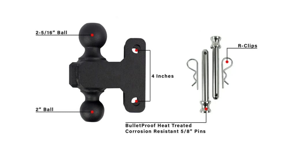 - Features the signature black textured powder coat and comes with two 5/8” corrosion resistant pins & R-clips to secure the dual ball into the channel of the hitch.