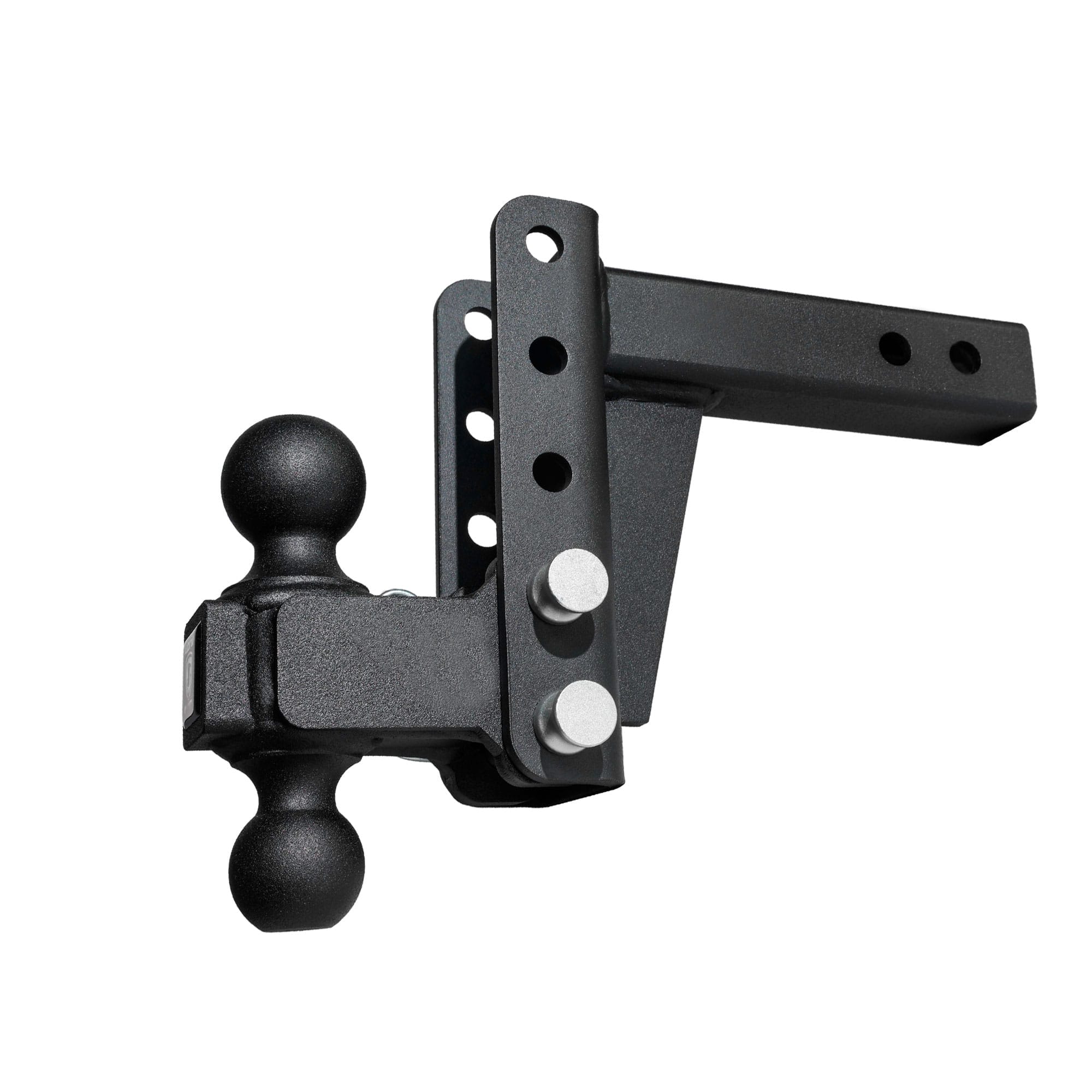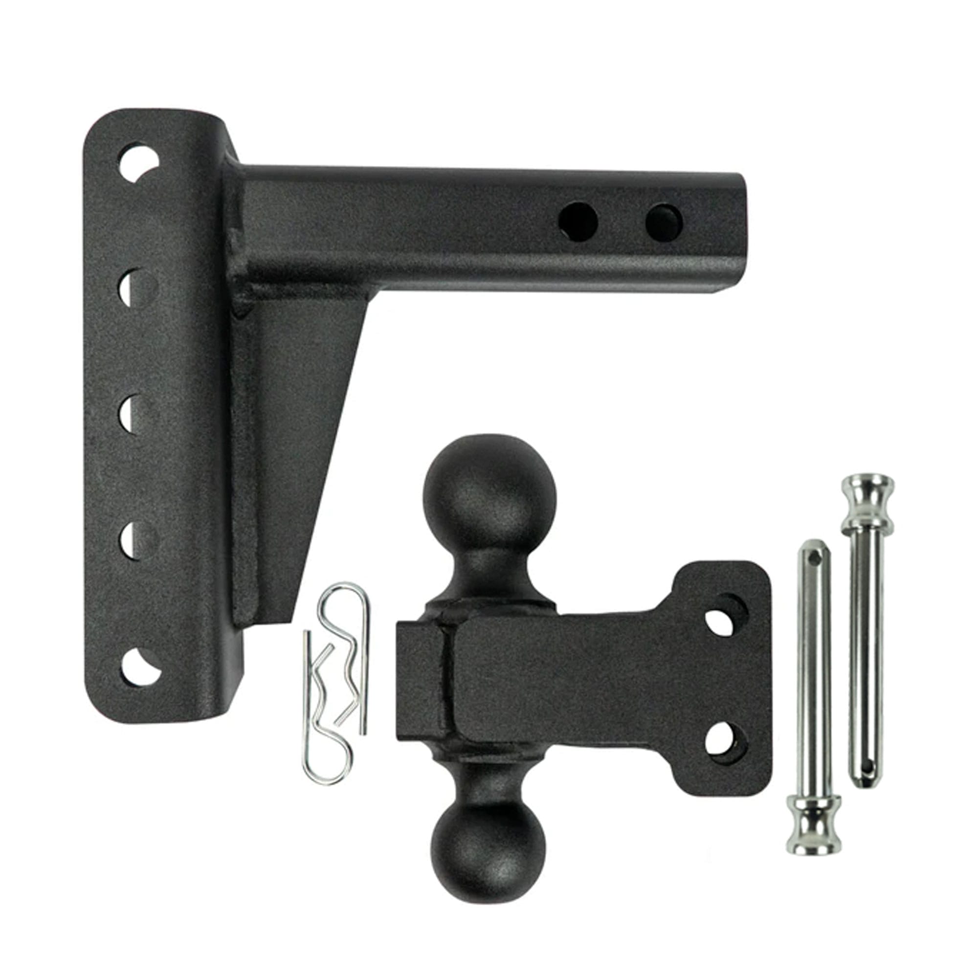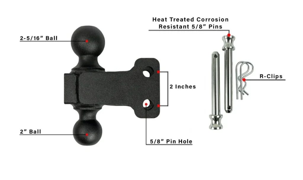 - Features the signature black textured powder coat and comes with two 5/8” corrosion resistant pins & R-clips to secure the dual ball into the channel of the hitch.