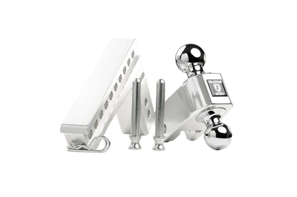 BulletProof aluminum hitches come standard with a 2” & 2-5/16” dual ball that is adjustable in 1” increments. This hitch offers 5 levels of adjustment to ensure you are towing level, which allows for a safer and more comfortable towing experience. One great feature of the 6” drop/rise Aluminum hitch is the ability to rotate the dual ball and store it behind the channel of the hitch!