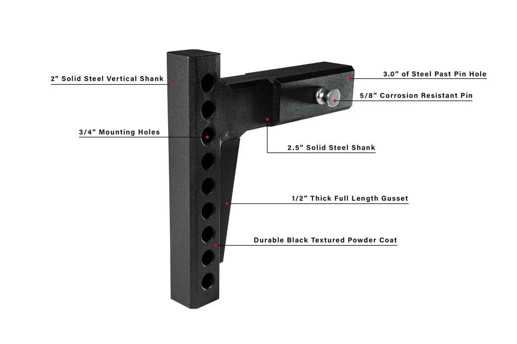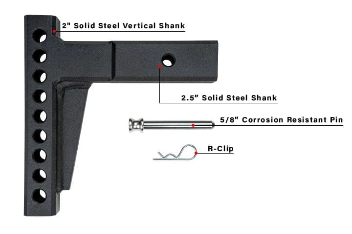 The BulletProof Weight Distribution Shank is the ultimate choice for those times you need to use a weight distribution system. This solid steel shank allows you to connect almost any weight distribution system. After modifying your vehicle’s suspension and/or adding larger tires, you may need a longer drop. The shank can be used in the drop or the rise position.