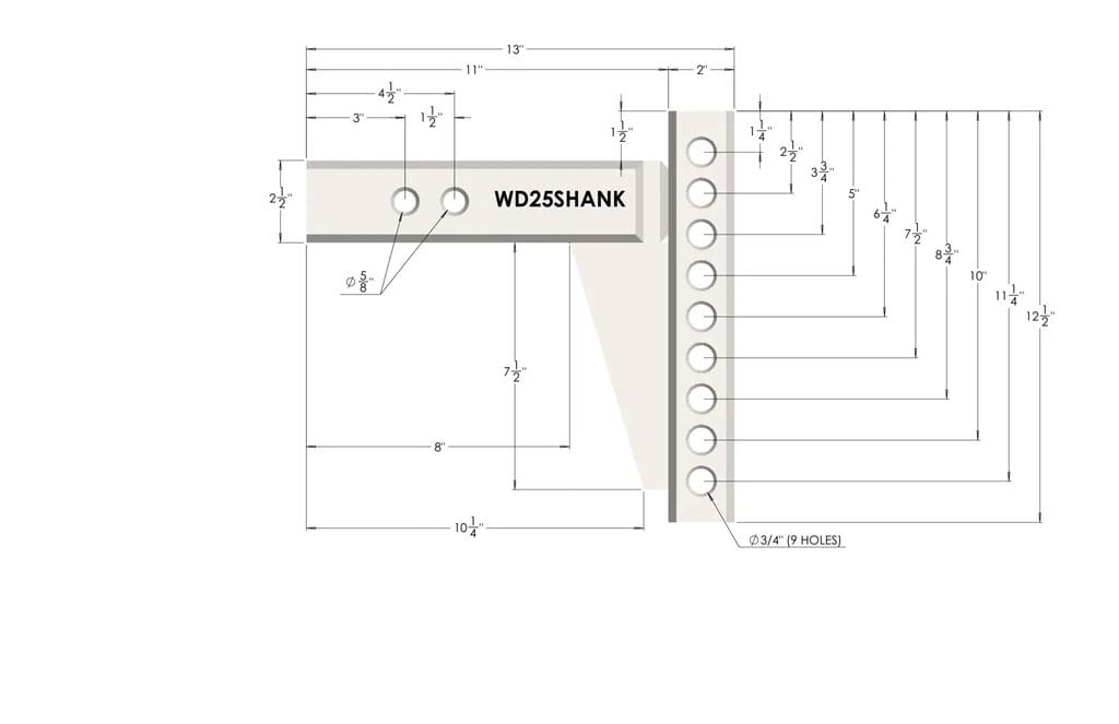 The vertical shank is 2″ wide and the holes are 3/4″ in diameter and spaced 1-1/4″ on center. This allows for more adjustment of the WD head to ensure you are towing level. Offers 7 different ride heights.